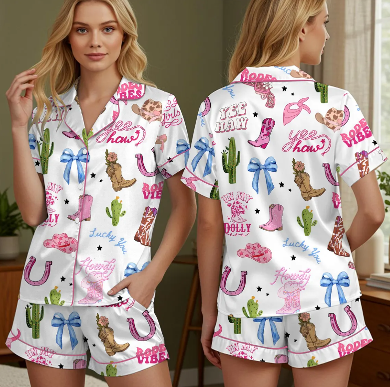 Pink Cowgirl Boots and Hat Pajamas Set, Western Country Cowgirl Sleepwear, Cute Boots and Hats PJs, Cozy Lounge Set, Trendy Gift for Her