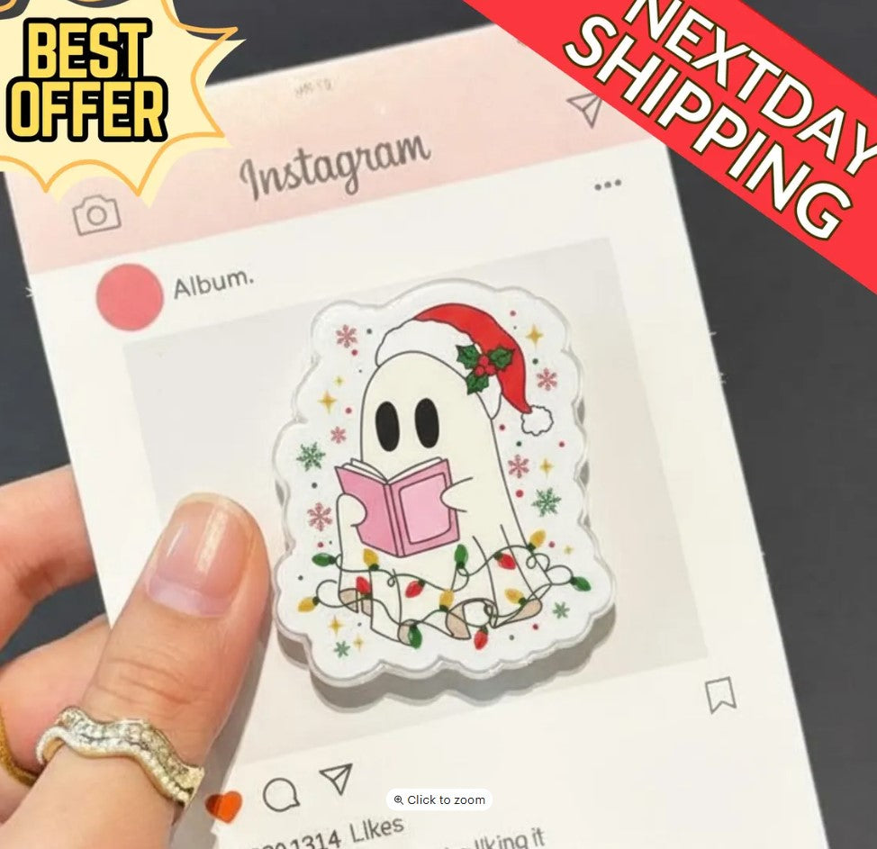 Christmas Ghost Magnetic Phone Grip: Cute Holiday Kindle Stand with Santa Hat & Book, Festive Phone Holder for Christmas Lovers