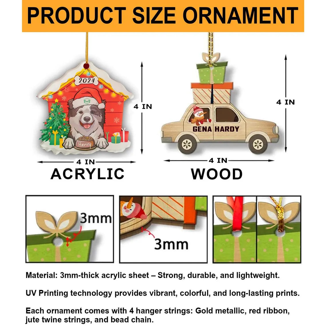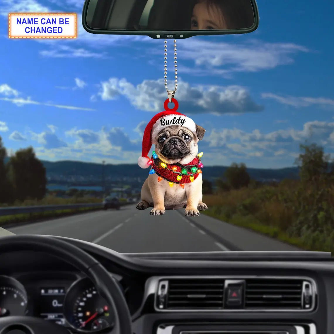 Custom Name Cute Sitting Pug Dog with Santa Hat Christmas Ornament, Christmas Tree Hanging Decor, Christmas Ornament, Flat 2D Ornament