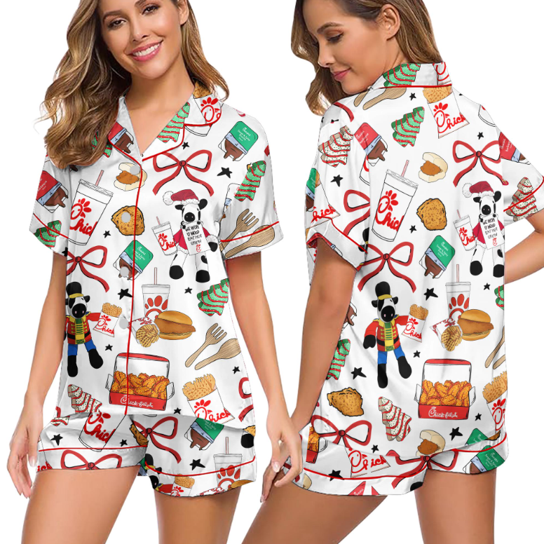 Christmas Chicken Nugget Silk Pajama Set, Food Print PJs with Chicken, Fries and Sauces, Cute Cozy Sleepwear Holiday Gift for Her, Chicken