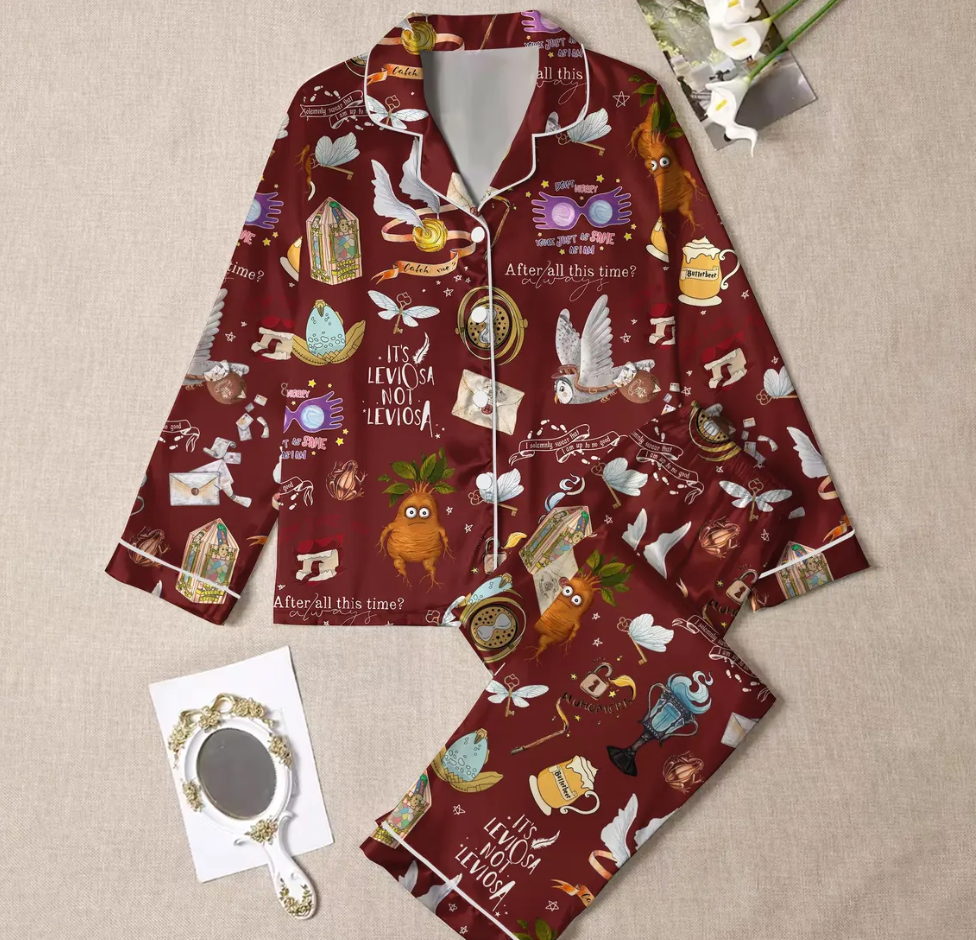 Magic Inspired Pajama Set, Leviosa Quotes, Owls, Spells & Wizard Icons, Cozy Women’s Silk PJs, Cute Wizarding Nightwear Gift,HP Silk Pajamas
