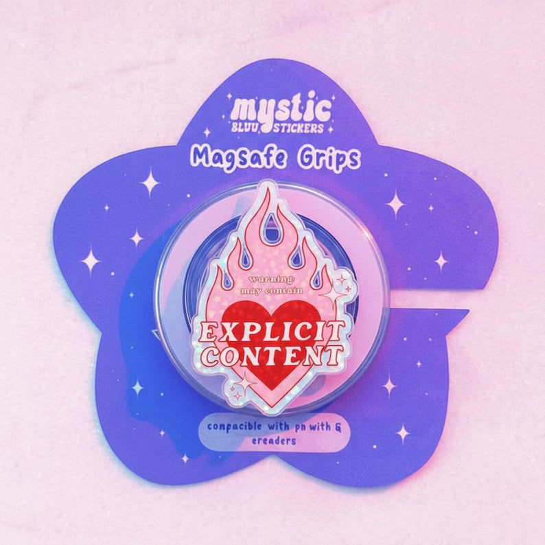 Explicit Content Magnetic Phone Grip: Warning Heart & Flame Stand, Phone Accessory, Fun Gift for Bold Individual, Magsafe Phone Holder