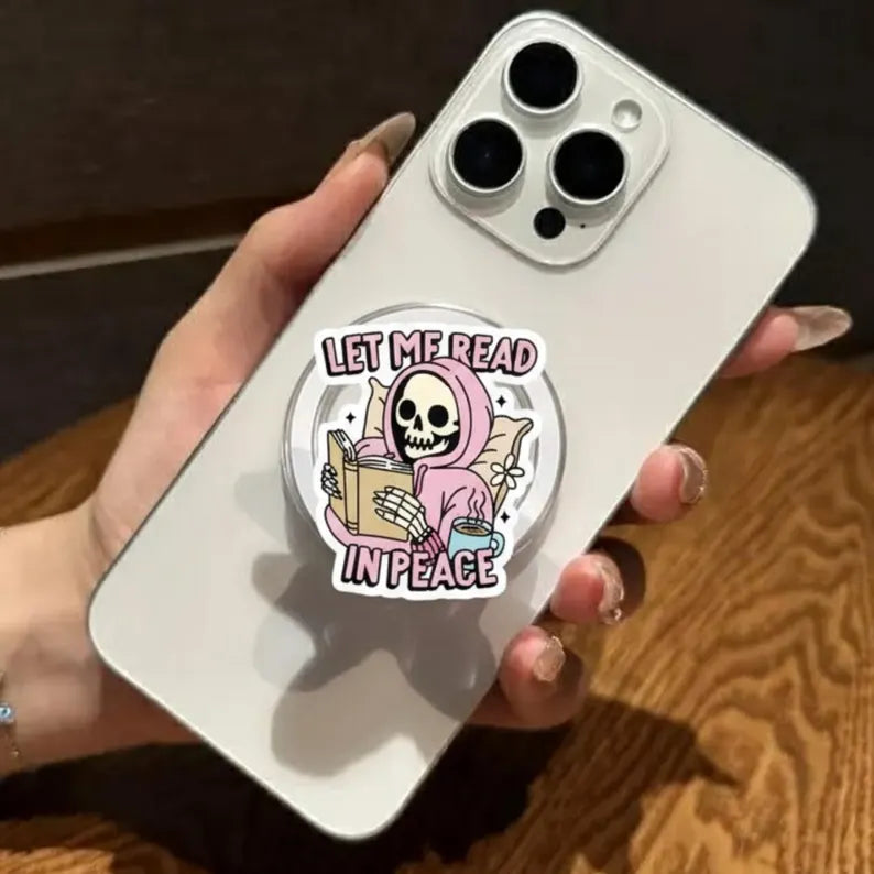 Let Me Read in Peace Magnetic Phone Grip β Funny Skeleton Reading Phone Holder, Kawaii Skeleton Phone Stand, Perfect Gift for Book Lovers