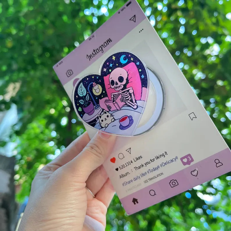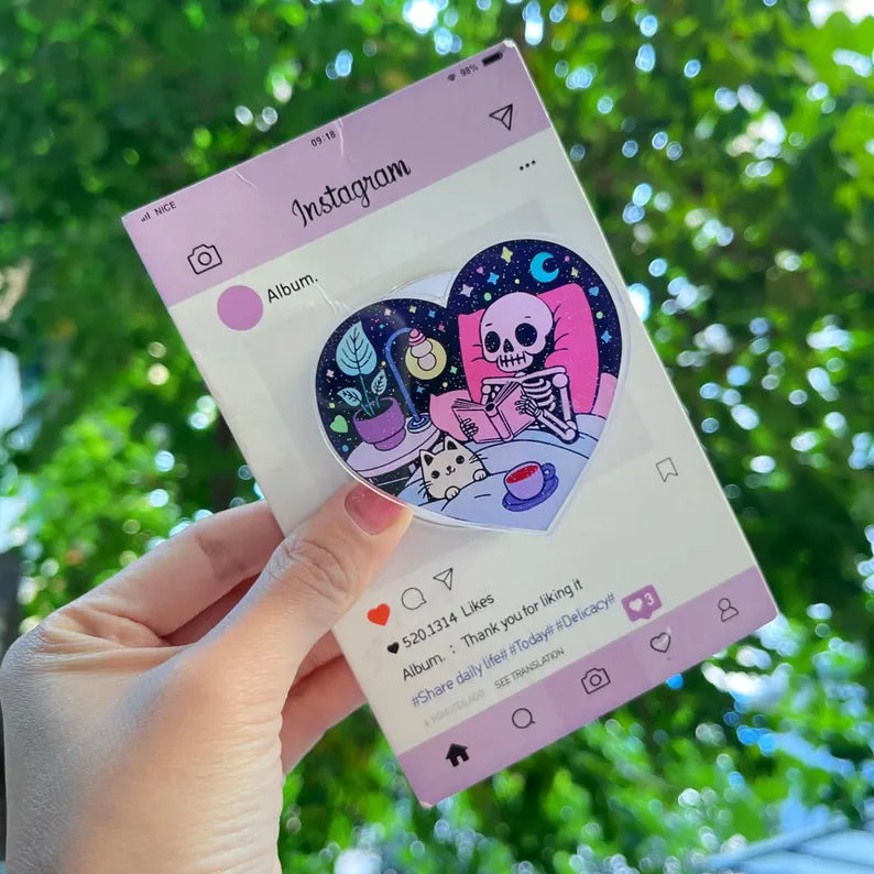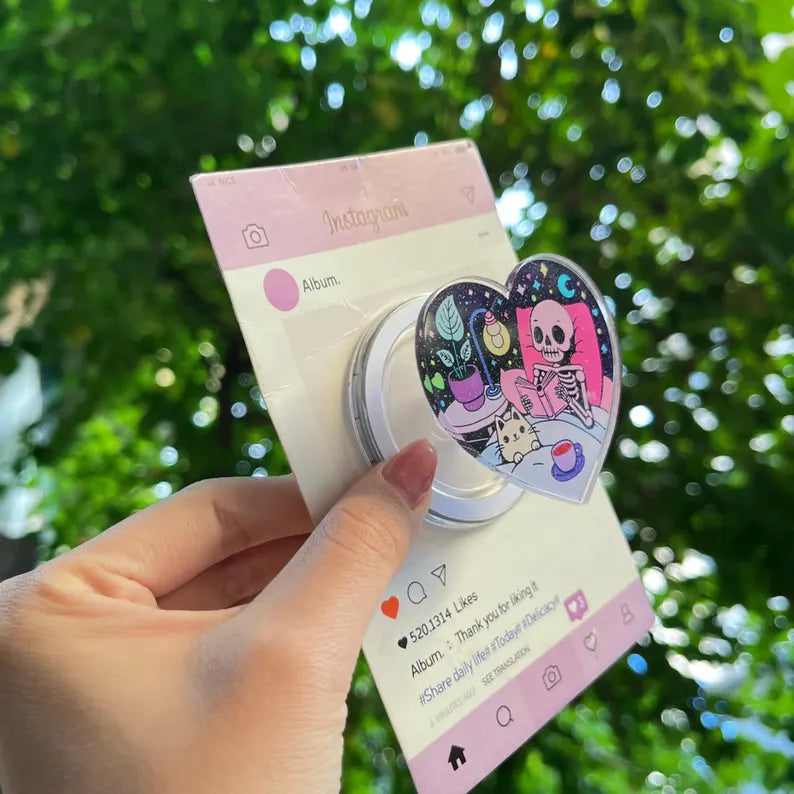๐ Add a touch of quirky charm to your phone with this Skeleton & Cat Griptok! Featuring a cute skeleton reading a book under the night sky with a cozy cat by its side, this heart-shaped phone grip is perfect for lovers of spooky aesthetics, skeletons, cats, or just anyone who loves cute and unique accessories.