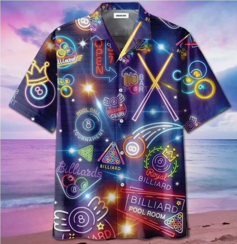 Billiards Pool Room Illuminated by Neon on a Hawaiian Shirt