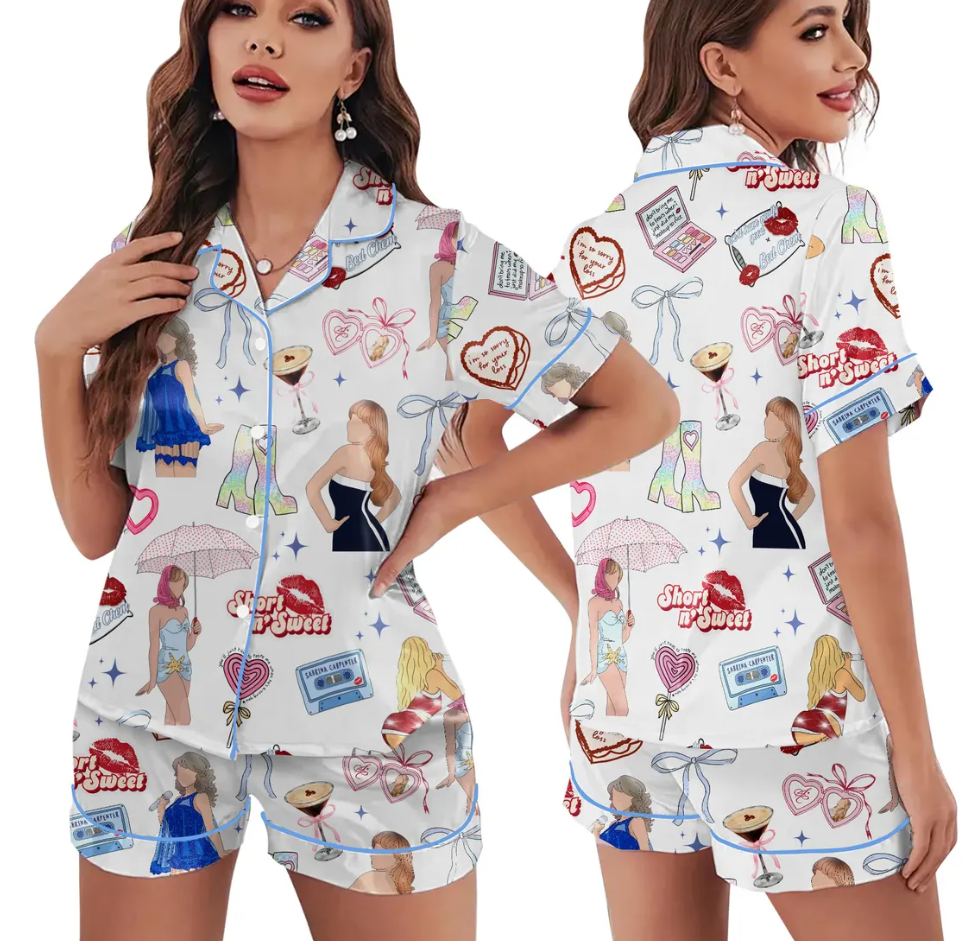 Short n’ Sweet Silk Pajamas for Women, Cute Kiss PJs, Funny Quote Sleepwear, Sassy Sabrina Carpenter Pajamas, Fun Cozy PJs Gift for Her