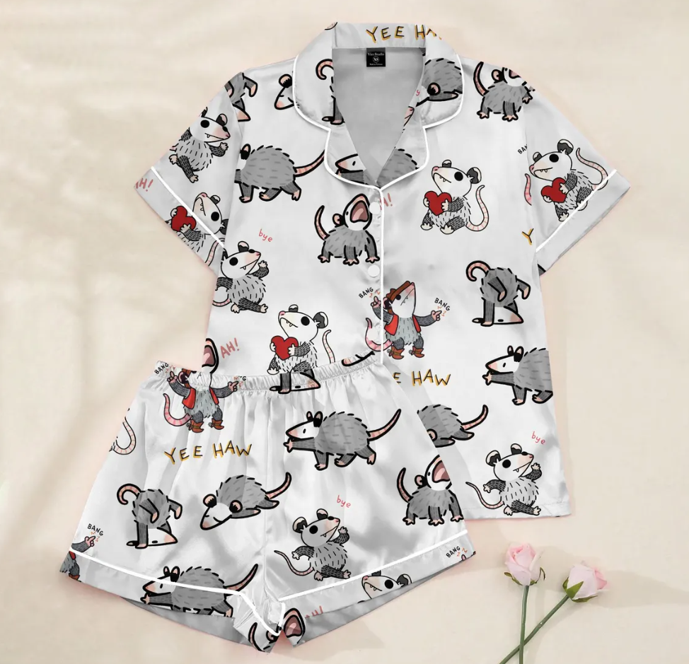 Funny Possum Pajama Set for Women – Cute Animal Print Satin Pajamas, Short Sleeve Button-Up Sleepwear, Cozy Loungewear Gift
