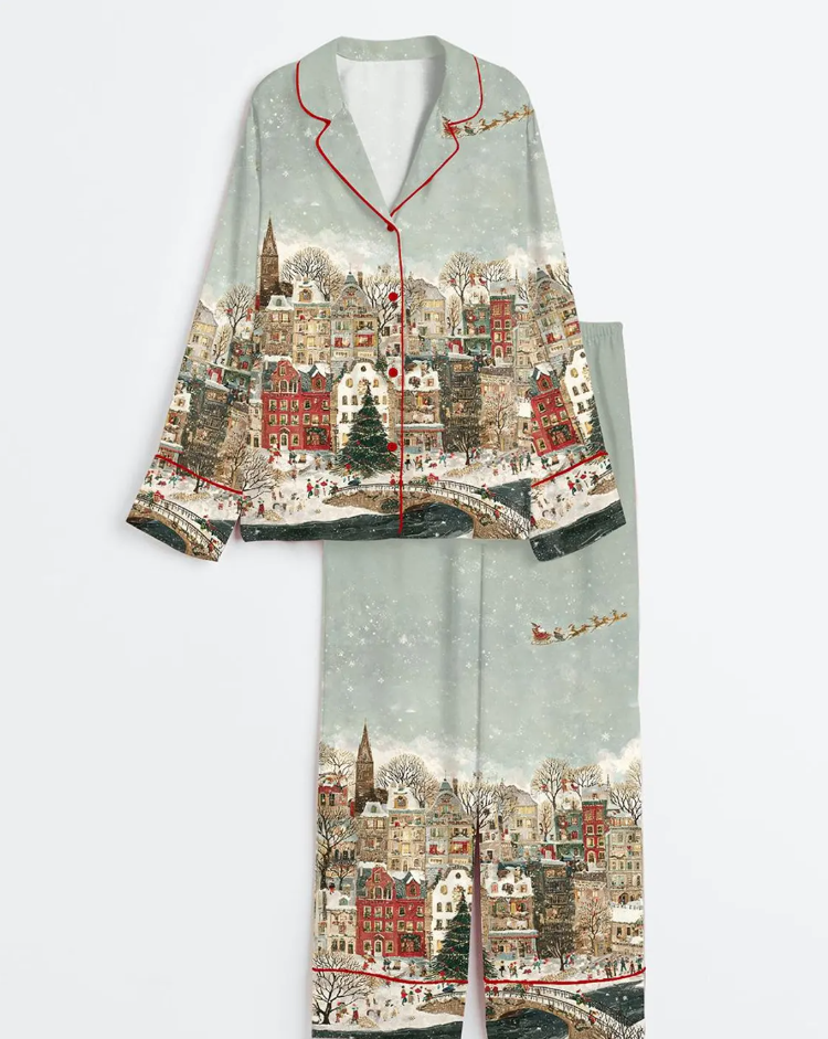 Christmas Town Whimsical Winter Village Art Long Sleeve Satin Pajama, Festive Holiday Sleepwear, Pajama Gift for Her, PJs Family